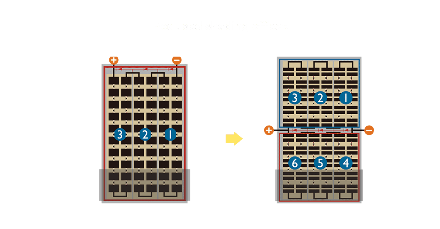 - 电池使用多条铜导线 (Copper wire) 于电池片上形成较短的电流路径,,提高电流收集效率,,,,采用圆形设计的铜导线较传统扁平式的铜焊带 (Ribbon),,,可增加入射至电池的光线量。。