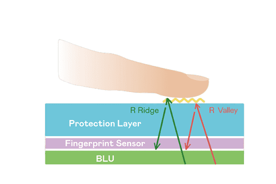 TFT 指纹扫描感测技术利用薄膜电晶体 (TFT) 当作光感测元件,,,藉由非晶硅 (a-Si) 与低温多晶硅(LTPS)既有光电转换特性对不同波段光源进行吸收,,,使感测 IC 读取阵列感测元件的光漏电差异,,,,转换成数位灰阶影像。。。。